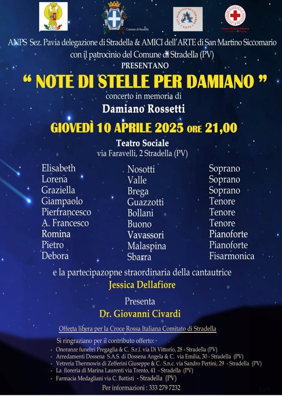 L'Associazione Nazionale della Polizia di Stato – Delegazione di Stradella, con la collaborazione dell’Associazione Amici dell’Arte di San Martino Siccomario, per ricordare il proprio Socio Damiano Rossetti scomparso nel luglio 2023, sta organizzando un concerto, ad ingresso libero, a sostegno della Croce Rossa Italiana Comitato di Stradella.
