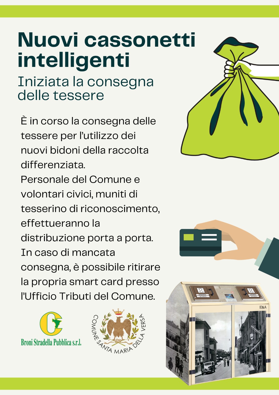 È iniziata la distribuzione delle tessere necessarie per l’utilizzo dei nuovi bidoni intelligenti per la raccolta differenziata.