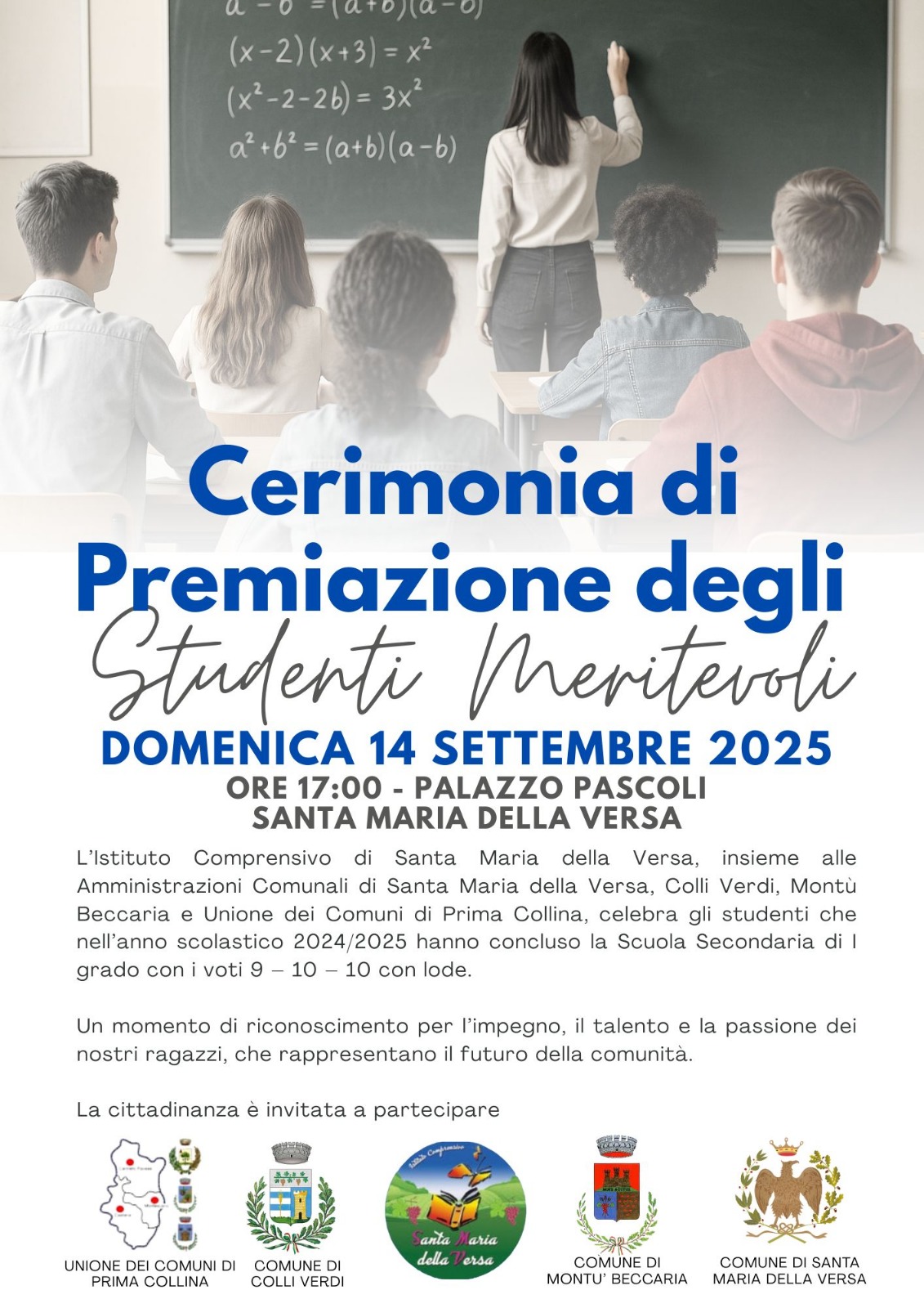 insieme alle Amministrazioni Comunali di Santa Maria della Versa, Colli Verdi, Montù Beccaria e Unione dei Comuni di Prima Collina celebra gli studenti che nell’anno scolastico 2024/2025 hanno concluso la Scuola Secondaria di I grado con i voti 9 – 10 – 10 con lode.
