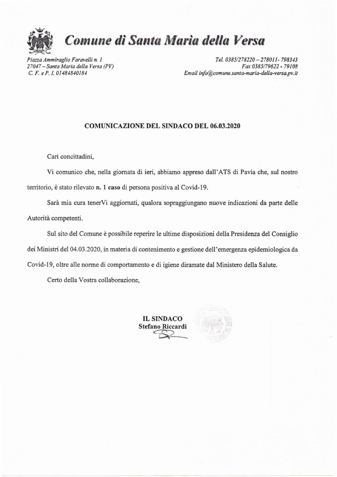 Vi comunico che, nella giornata di ieri, abbiamo appreso dall'ATS di Pavia che, sul nostro territorio, è stato rilevato 1 caso di persona positiva al Covid-19.