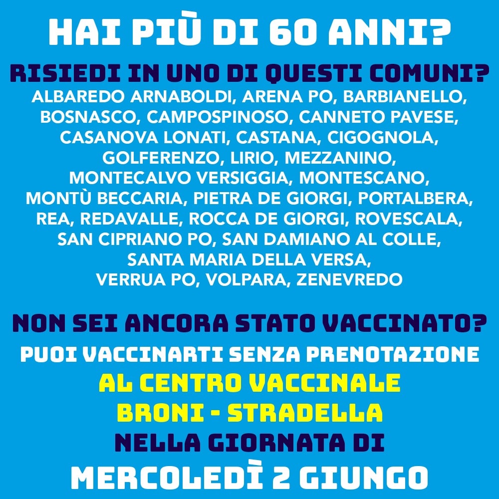 💉Nella giornata di mercoledì 2 giugno, presso il Centro Vaccinale di Broni - Stradella, è prevista una giornata di vaccinazione per gli over 60 non ancora vaccinati💉