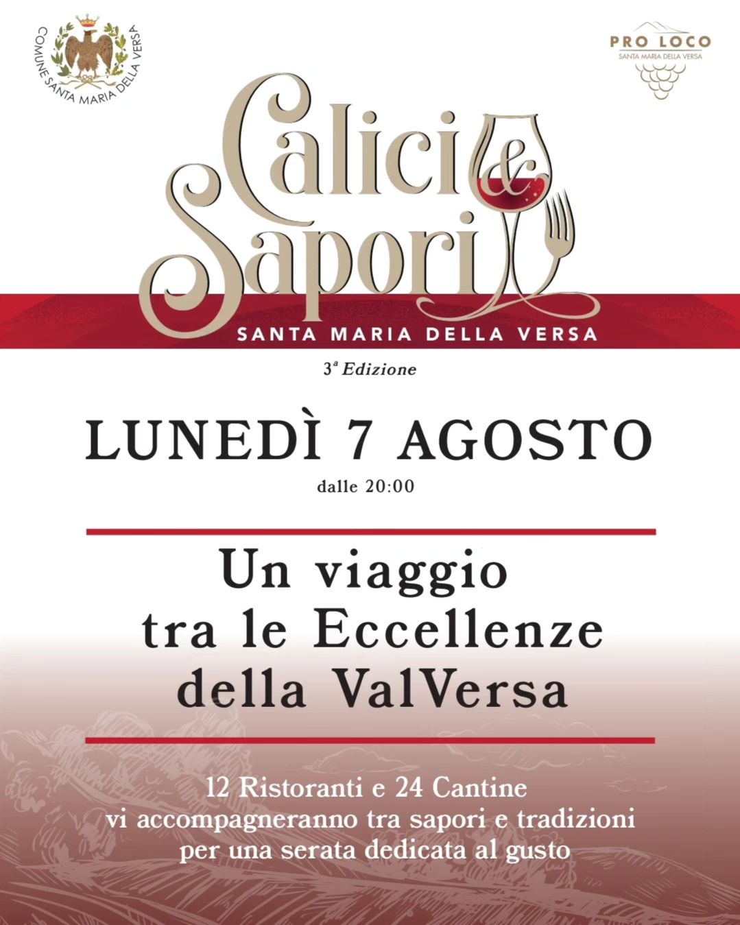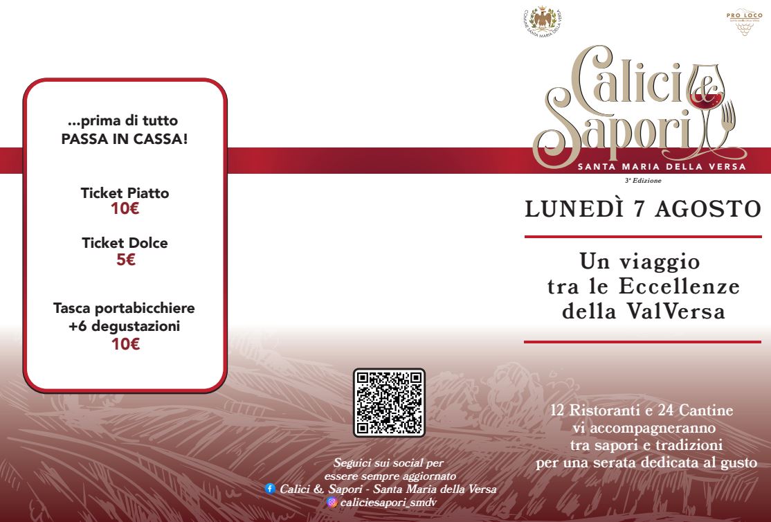 L'Amministrazione Comunale, in collaborazione con la Proloco Santa Maria della Versa, è lieta di invitarvi alla terza edizione di "CALICIE E SAPORI", un viaggio tra le eccellenze della Valversa.
