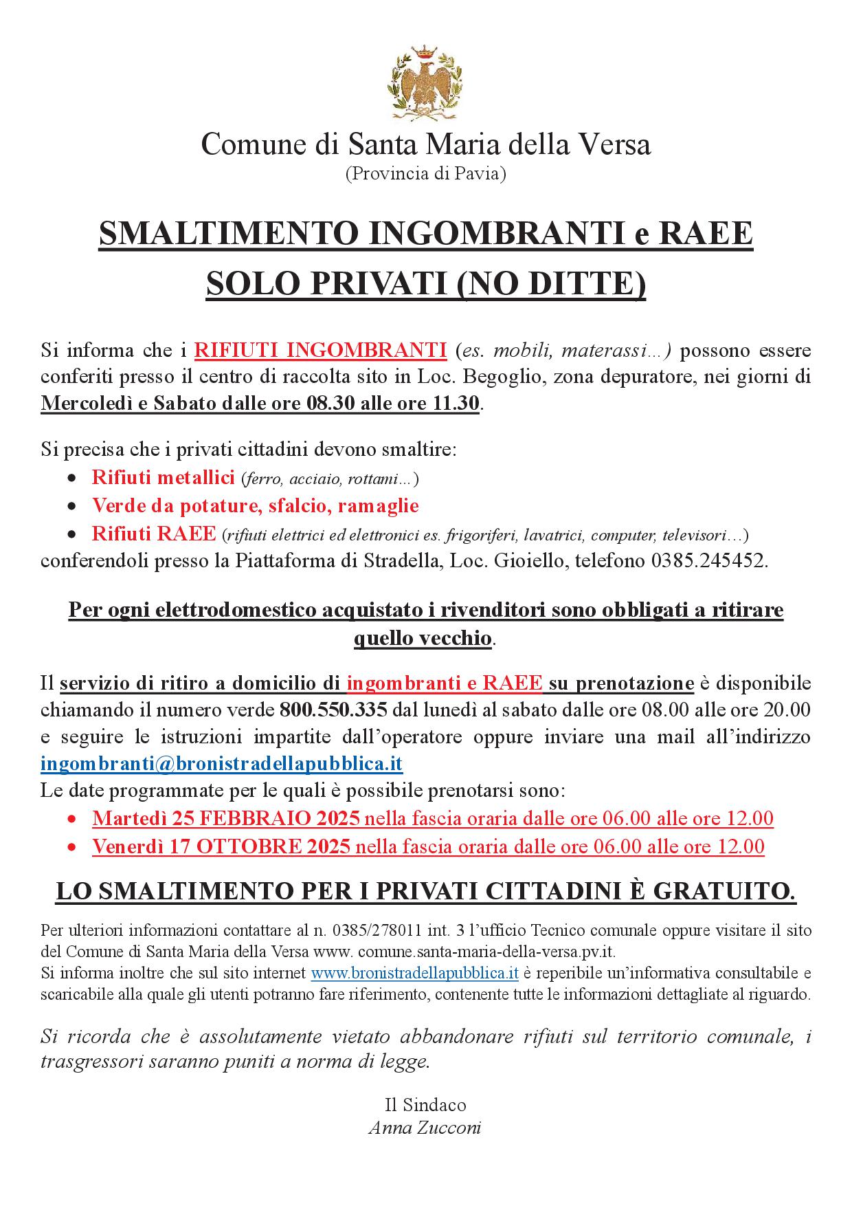 Si informa che i RIFIUTI INGOMBRANTI (es. mobili, materassi…) possono essere conferiti presso il centro di raccolta sito in Località Begoglio, zona depuratore, nei giorni di Mercoledì e Sabato dalle ore 08.30 alle ore 11.30.