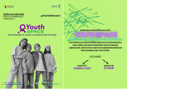 Venerdì 5 dicembre 2025, alle ore 16.00, presso i locali di P.zza Ammiraglio Faravelli n. 3 a Santa Maria della Versa, si terrà l'inaugurazione del centro di aggregazione giovanile "Youth Space"
