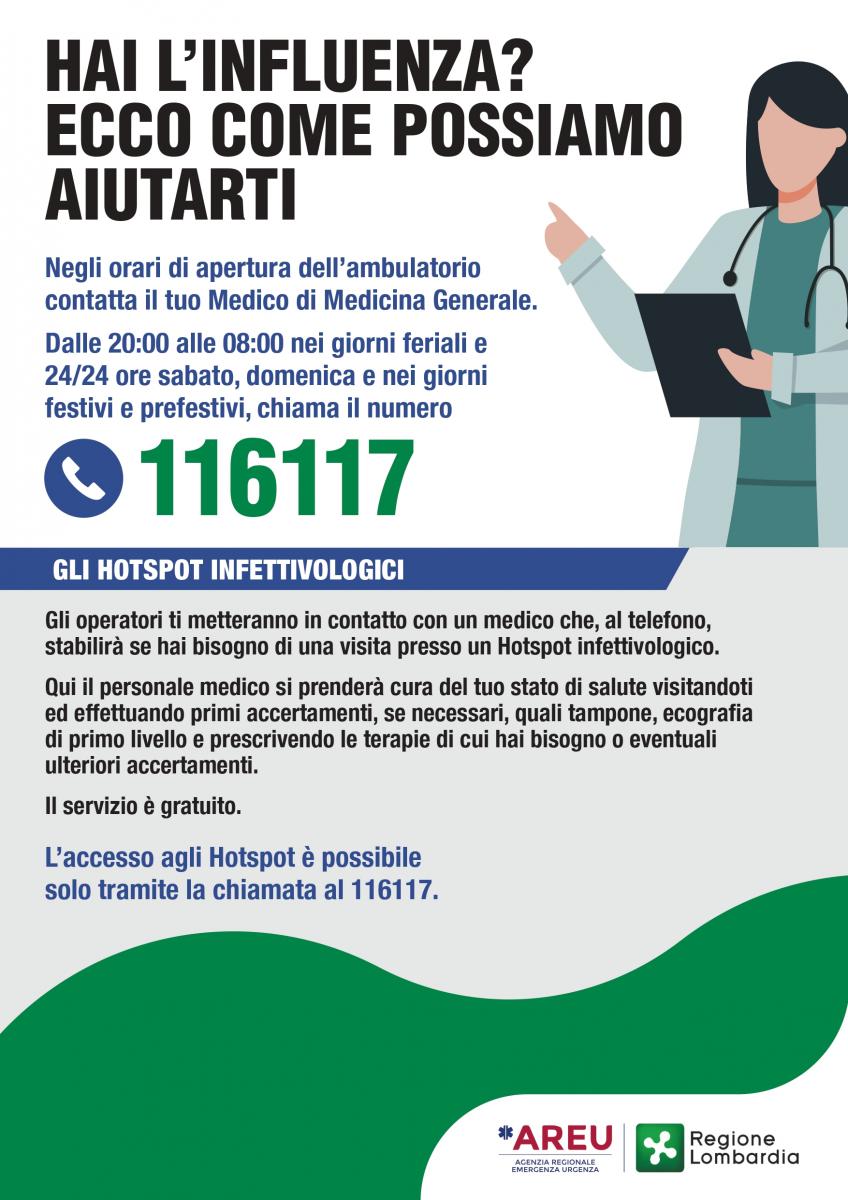 E' attivo il progetto Hotspot Infettivologico, patrocinato da Regione Lombardia, per potenziare la Continuità Assistenziale territoriale e migliorare la gestione delle sindromi respiratorie virali durante i mesi invernali durante le fasce orarie in cui non è prevista l’attività ordinaria dei medici di medicina generale (MMG).